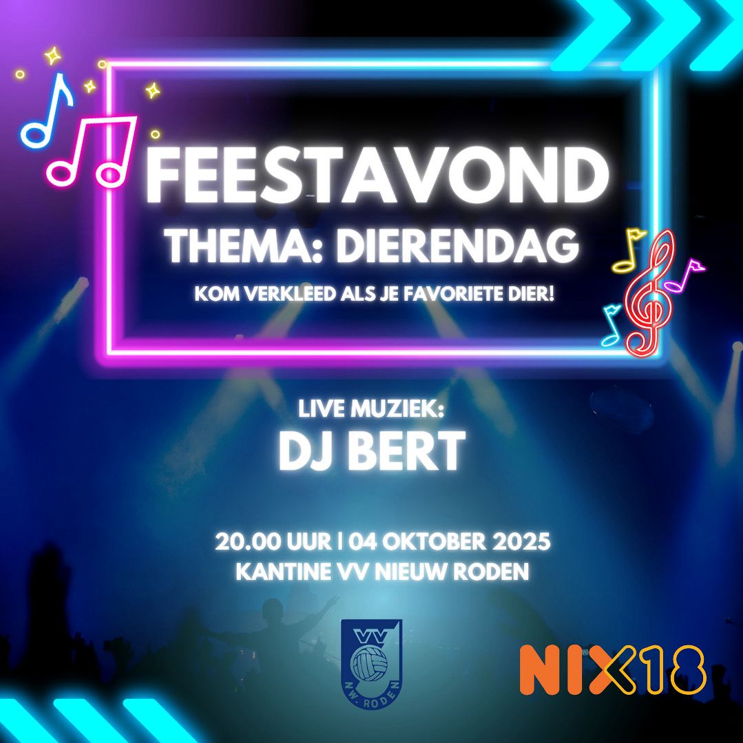 Op zaterdagavond 4 oktober organiseert VV Nieuw Roden een feestavond in de eigen kantine. Bij deze willen we alle sponsoren, leden, vrijwilligers, supporters en een ieder die de club een warm hart toedraagt uitnodigen.