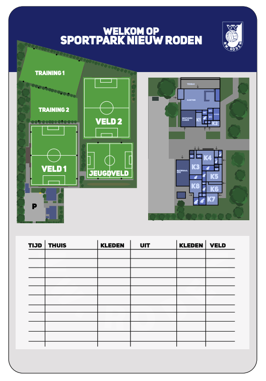 Accommodatie Het sportcomplex van de vv Nieuw Roden ligt net buiten de bebouwde kom ten westen van het dorp Nieuw Roden, richting Zevenhuizen, aan de Zevenhuisterweg 3a, 9311 VA Nieuw Roden, tel: 050-5016695.